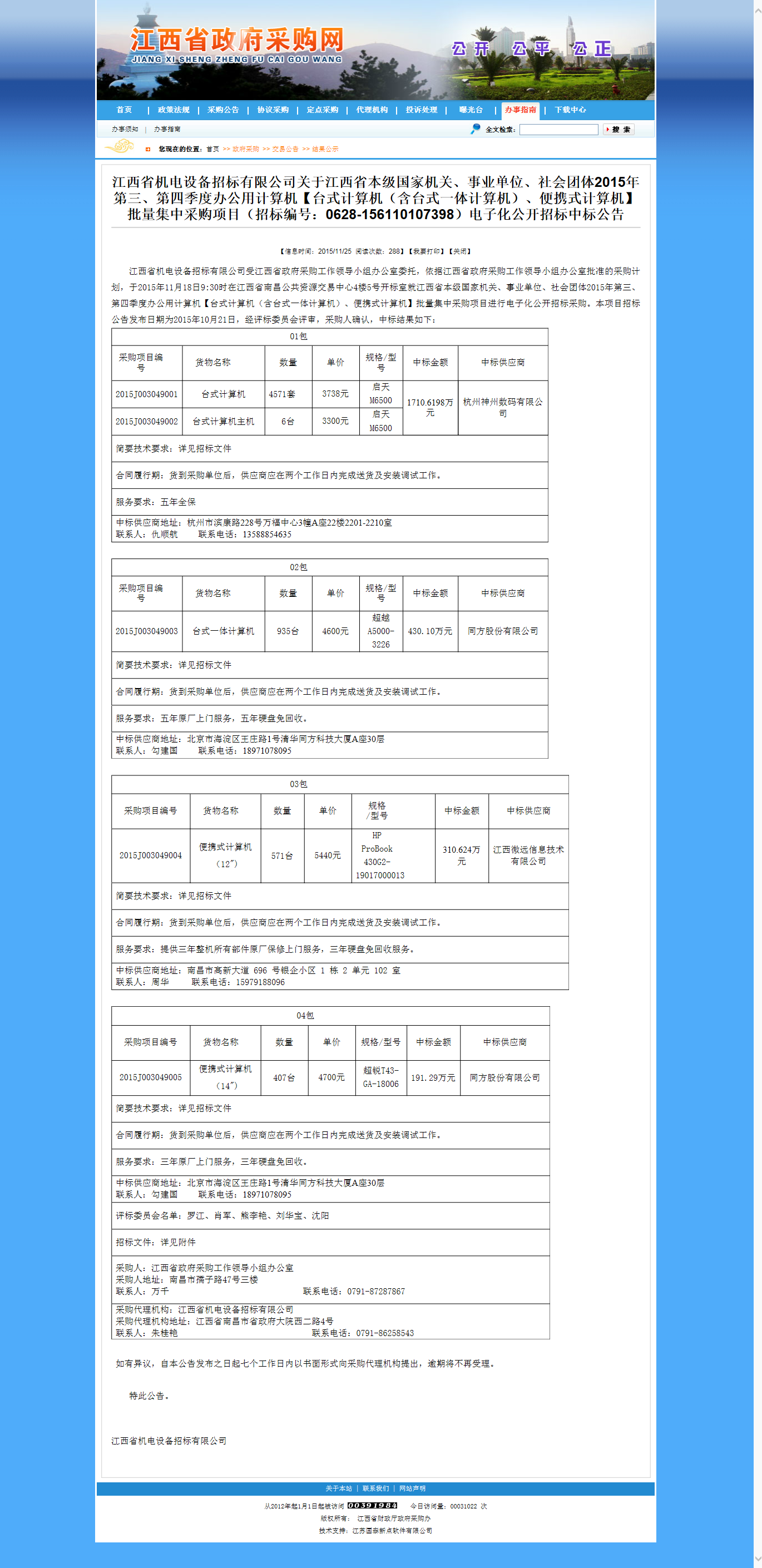 關(guān)于省本級計(jì)算機(jī)集中批量采購中標(biāo)的通知