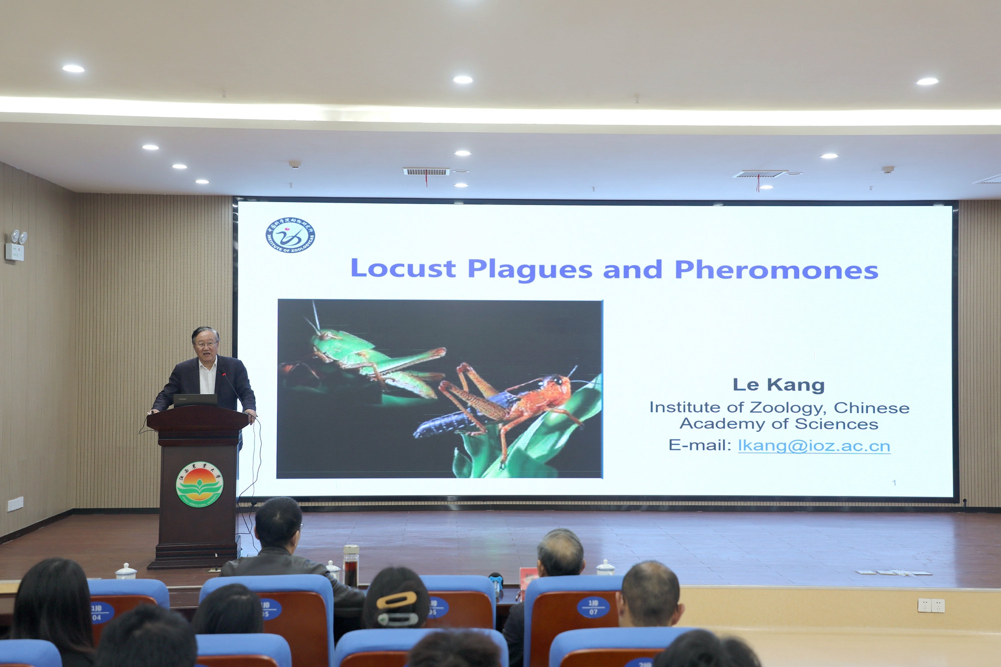 康樂以“蝗蟲信息素與成災機理”為題,結合自身研究經歷從蝗蟲、蝗災及成災機理的國內外研究進展、學術界當前認定的蝗蟲PAN非聚集信息素而是用于阻止同類相食和抵御天敵和4-乙烯基苯甲醚(4VA)作為聚集信息素的分子機制等四個方面闡述了蝗蟲信息素與成災機理。