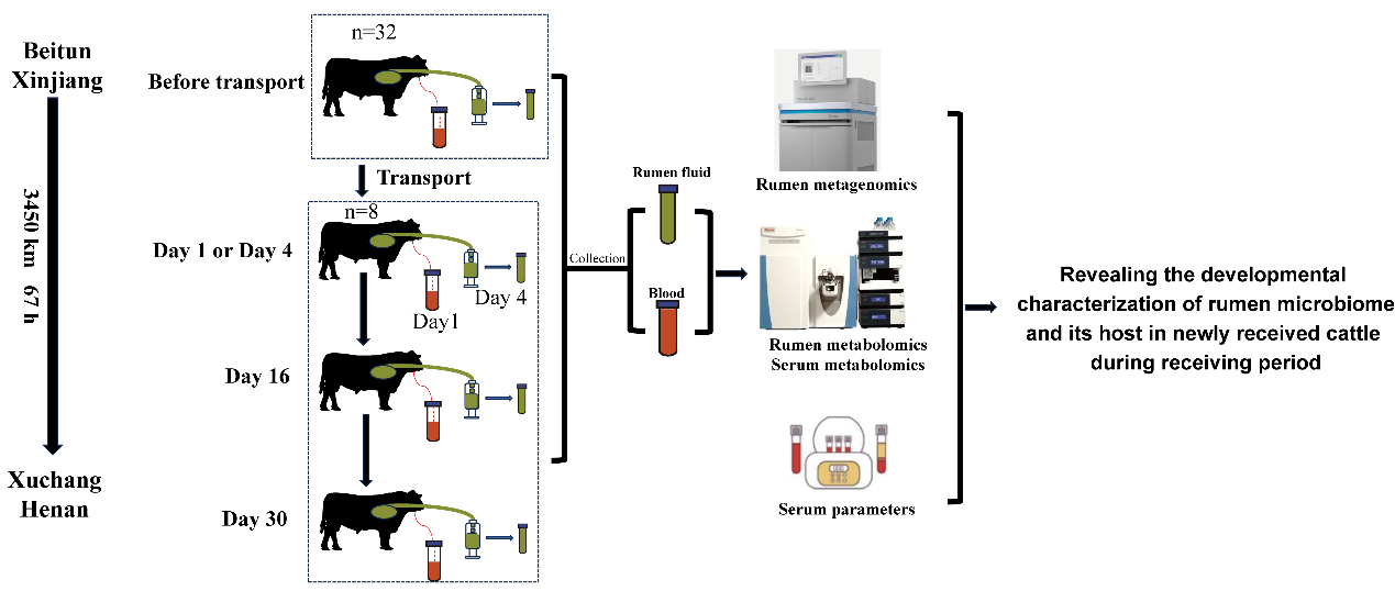 研究背景:由于我國南北方氣候、草料資源差別巨大,形成了“北繁南育—北牛南調”的產業模式和格局,新進牛應激與健康問題十分突出。新進牛過渡期內遭受多重應激造成生長阻滯、免疫力下降、疾病多發甚至死亡,是影響我國肉牛產業發展重大問題。據統計,每年造成約23億元的巨大的經濟損失。因此,新進牛過渡期應激預防和緩解技術研究成為國內外重大課題。近年來,采用藥物防治,雖然顯著降低了新進牛的死亡率,但因藥物防治引起的生長受阻問題十分嚴重。瘤胃微生物穩態是肉牛健康生長的根基,血液代謝產物是新進牛健康狀況直觀反映。因此,探索新進牛在應激過渡期內的生理變化規律,特別是應激期新進牛瘤胃微生物及整個機體代謝變化規律十分重要,對揭示新進牛生長遲緩機制,制定精準營養干預策略,促進新進牛健康生長具有重大深遠意義。