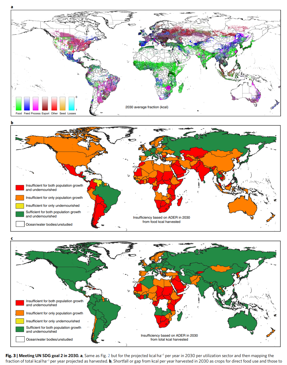 該研究進一步明確,到2030年,至少有31個國家可能無法滿足自身糧食需求,即使國內所有收獲的卡路里都被用于直接食品消費。另外17個國家將無法在同一時間范圍內滿足其預期人口增長的糧食需求,這可能會加劇其營養不良人口的糧食不安全負擔。