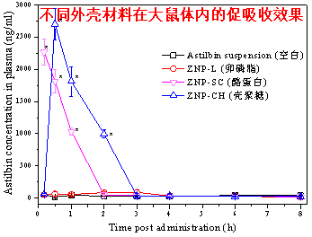 黃酮類物質(zhì)是食品中重要的功能成分,有多種健康促進作用。但黃酮很難吸收,且在體內(nèi)經(jīng)I相和II相代謝可形成十余種代謝產(chǎn)物(如甲基化、葡萄糖醛酸化、硫酸化等)。復雜的代謝過程使得很難對ZNP促進黃酮體內(nèi)吸收效果進行準確量化。課題組發(fā)現(xiàn),由于特殊的鼠李糖結(jié)構(gòu),黃酮落新婦苷(龜苓膏中主要活性成分)在大鼠體內(nèi)的代謝非常獨特,幾乎不發(fā)生轉(zhuǎn)化而主要以本體的形式被吸收和血液輸送。因此,落新婦苷是一種很好的模式黃酮用于定量不同口服給藥載體的體內(nèi)促吸收效果。在此基礎上,課題組分別以卵磷脂、殼聚糖和酪蛋白為外殼材料,設計了三種不同的負載落新婦苷的ZNP,研究外殼材料對ZNP體內(nèi)外性質(zhì)的影響。結(jié)果表明三種殼材料都可顯著增加ZNP體外穩(wěn)定性,但體內(nèi)促吸收效果差異巨大。殼聚糖、酪蛋白和卵磷脂促進落新婦苷體內(nèi)吸收倍數(shù)分別為18.2,9.3和1.89倍。其主要機制為殼聚糖和酪蛋白具有腸道黏附性能,可以顯著減少和推遲糞便對藥物的排泄;而卵磷脂沒有該性能。殼聚糖因為帶有正電荷,與帶負電的黏液蛋白結(jié)合能力比酪蛋白更強;但殼聚糖作為殼材料很容易使ZNP粒徑過度增大,弱化滲透黏液層能力,從而減弱體內(nèi)促吸收效果。