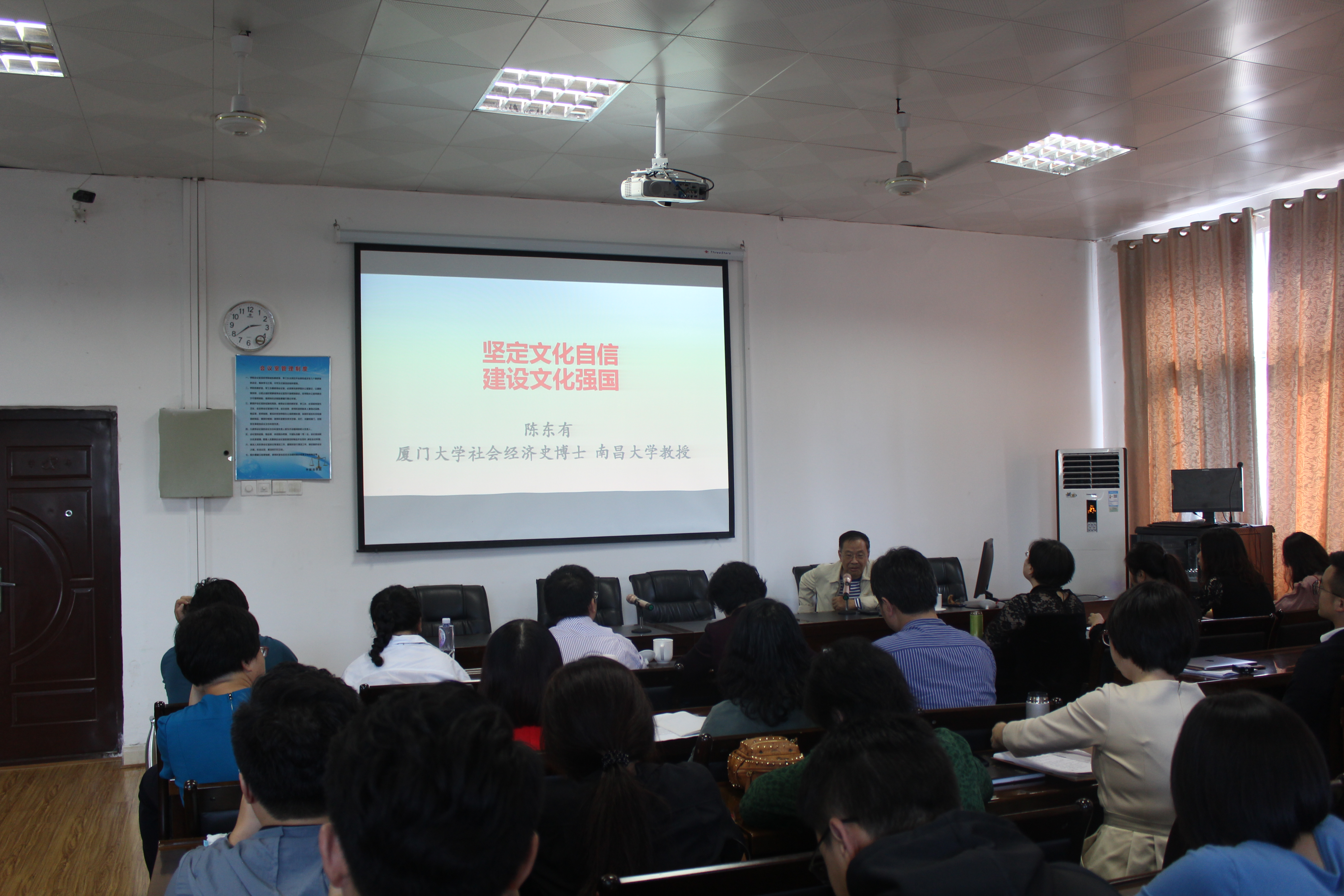 近日,南昌大學(xué)博導(dǎo)、原江西省委宣傳部常務(wù)部長(zhǎng)陳東有教授以《堅(jiān)定文化自信、建設(shè)文化強(qiáng)國(guó)》為題,給外國(guó)語學(xué)院師生作專題講座,校紀(jì)委書記喬金霞主持,全院老師和研究生近100人現(xiàn)場(chǎng)聆聽講座。