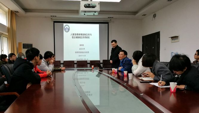 12月20日上午,武漢大學病毒學國家重點實驗室副主任、國家杰青陳明周教授應邀來我校進行學術交流,為生工院和動科院的師生作了題為《人副流感病毒復制及其與宿主細胞相互作用》的報告。報告由病原微生物所負責人主持。